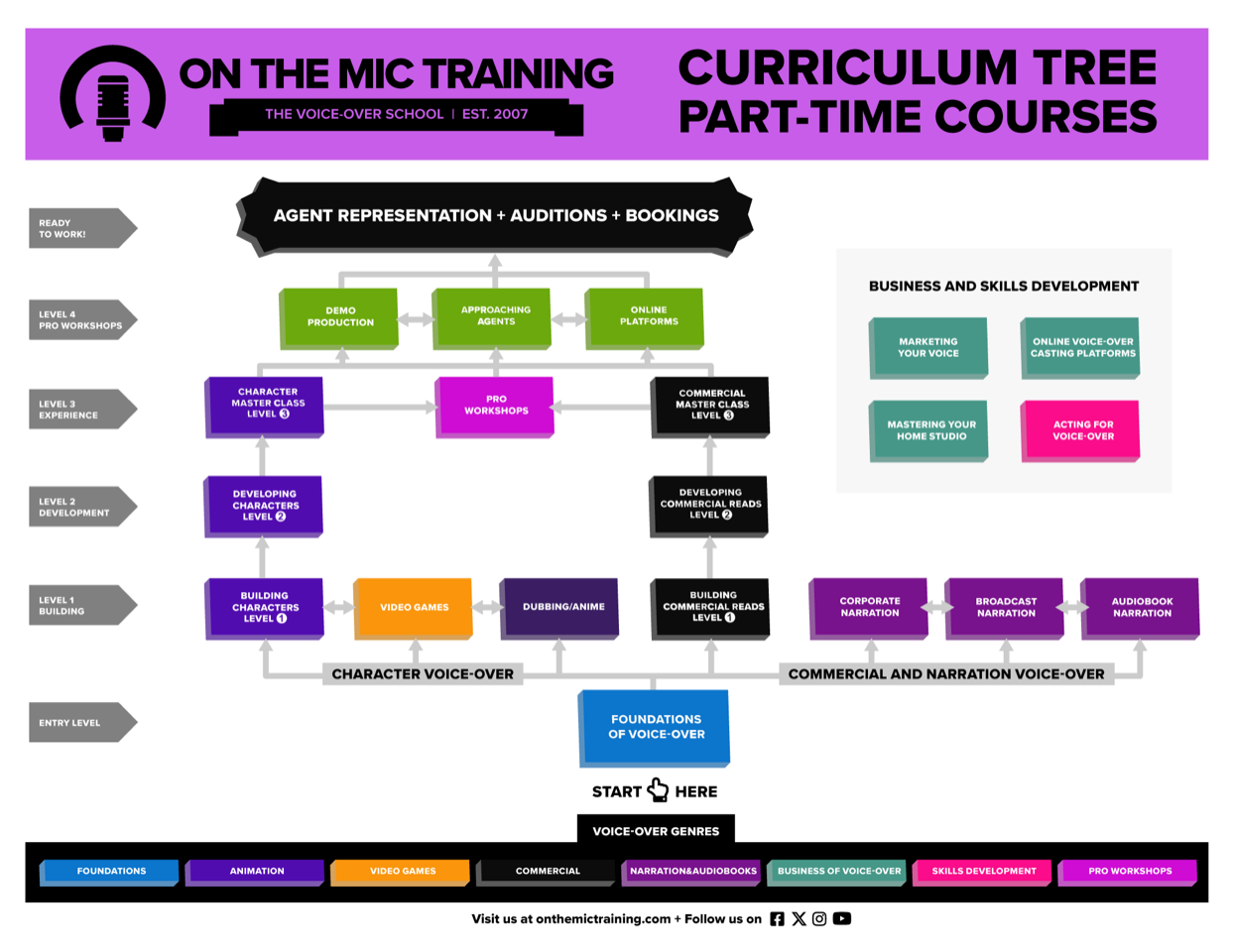 Any of our level 1 classes or classes with no level associated with them are a great next step, but it depends on your interests. Foundations of Voice-over offers generalized voice-over training, while our other classes specialize in specific areas. Business classes focus entirely on the business and industry, while performance classes briefly touch on industry and technical topics.
